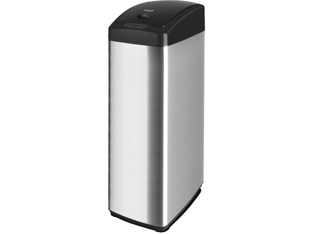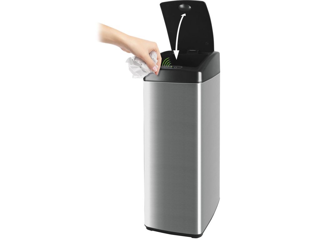 Senzorové otevírání: Využívá fotoelektrickou technologii. Stačí přiblížit ruku nebo předmět k čidlu a víko se automaticky a tiše otevře. Po vhození odpadu se opět samo zavře.
