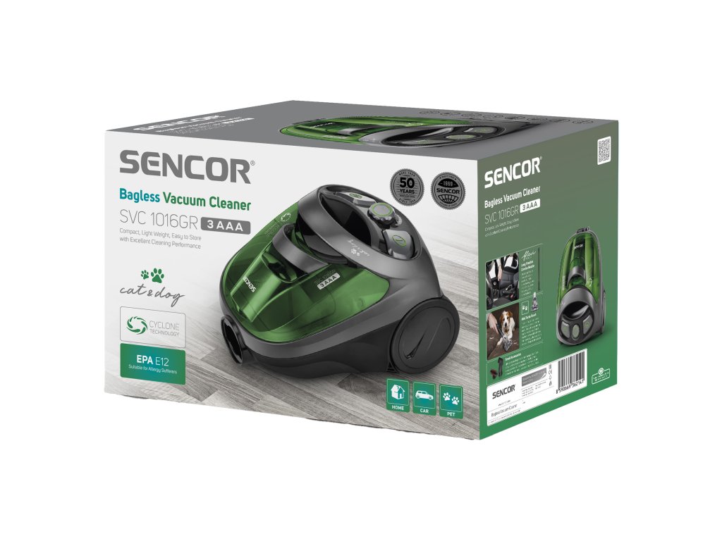 Sencor SVC 1016GR 3AAA je moderní a úsporný vysavač, který kombinuje vysokou efektivitu s precizní filtrací. Díky cyklónové technologii udržuje stálý sací výkon a zbaví váš domov nečistot s maximální důsledností. Označení 3AAA zaručuje nejvyšší třídu v energetické účinnosti, filtraci prachu i vysávání tvrdých podlah.