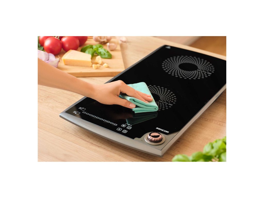 Snadná údržba: Hladký sklokeramický povrch stačí po vychladnutí jednoduše setřít navlhčeným hadříkem. Protože se plotýnka nerozpálí na vysoké teploty, vyteklé jídlo se na ní nepřipálí.