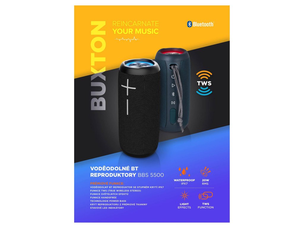 Už vás nebaví poslouchat hudbu jenom doma? Nebo se bojíte vzít reproduktor ven, aby ho neskolil první deštík? S Buxton BBS 5500 Blue se na tyhle starosti můžete vykašlat! Tenhle nadupaný, jednoduše přenosný krasavec vám dodá skvělý zvuk do každé místnosti i ven – a to i když se rozhodne, že si zaplave.
